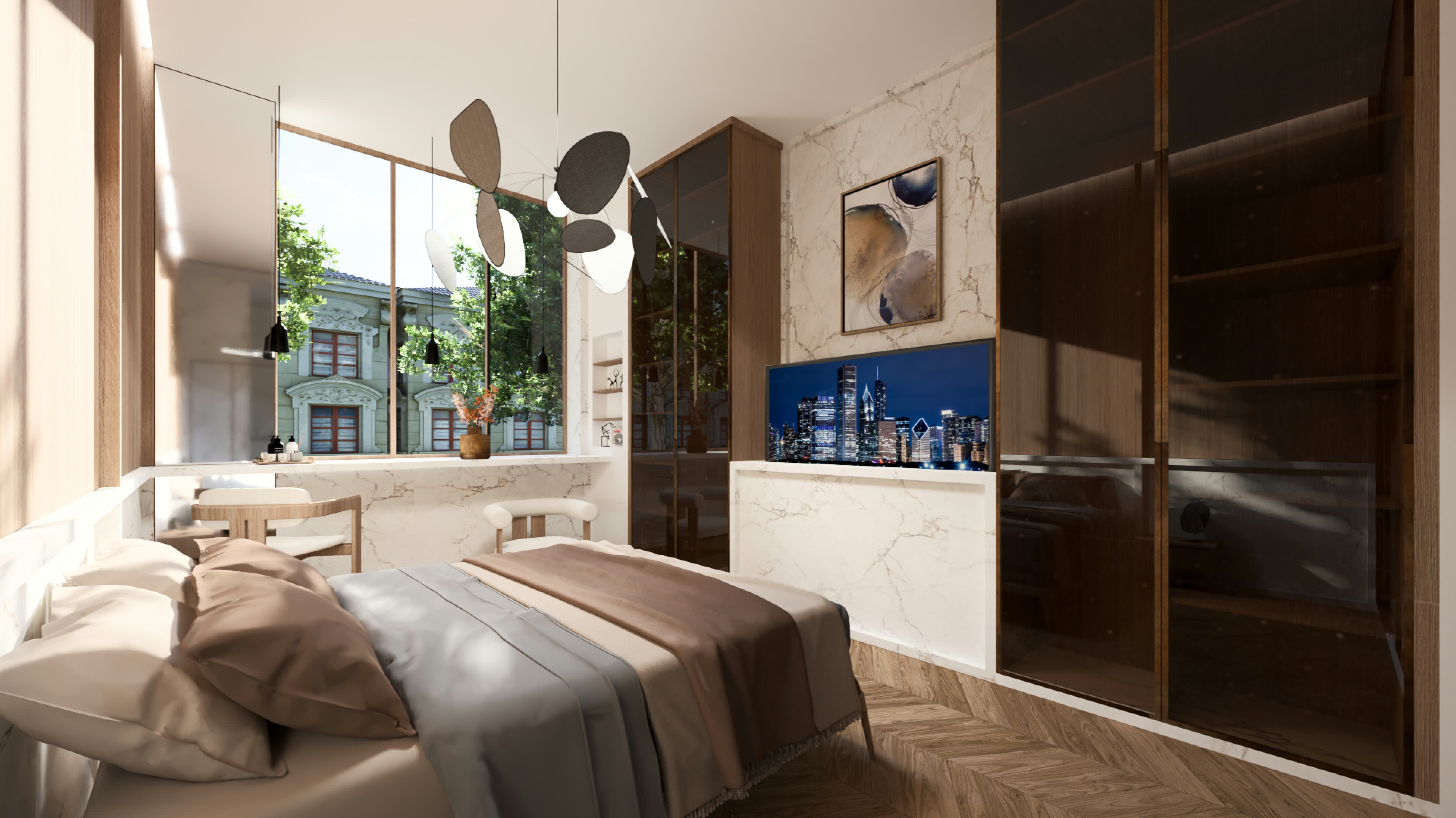 Dans ce projet, il s’agit de repenser entièrement une chambre d’hôtel haut de gamme pour en faire un lieu d’exception. Plus qu’un simple espace de nuit, la chambre devient une véritable suite contemporaine, où confort, sophistication et atmosphère immersive s’entrelacent.